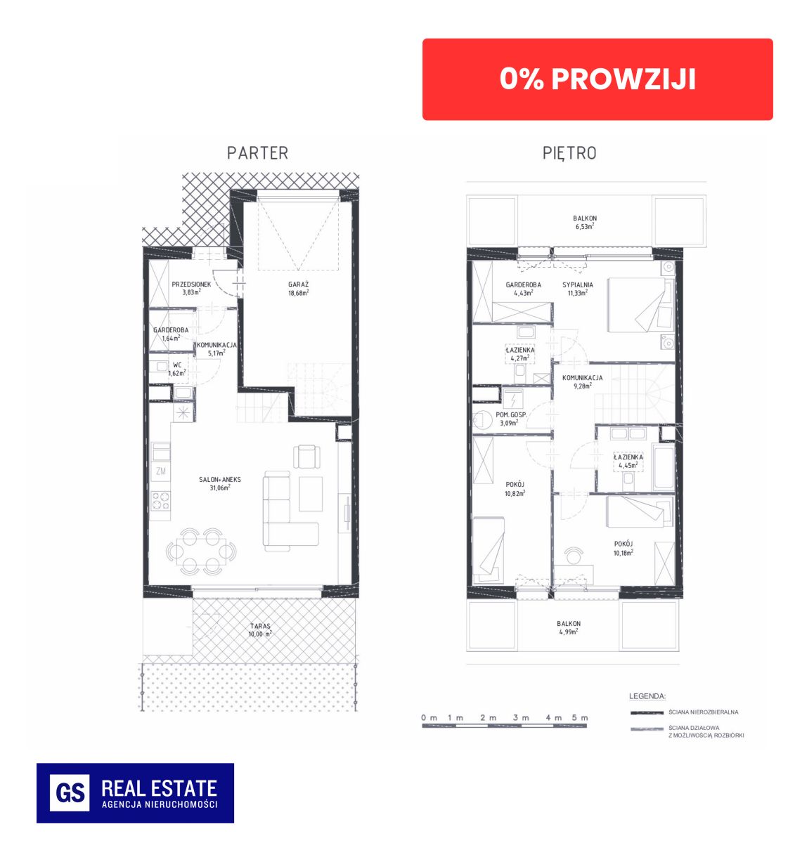 Na parterze: salon z aneksem kuchennym, przedsionek, garderoba, wc.